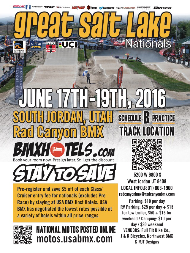 Great Salt Lake Nationals – Pro Series By White Lotus Sports on June 10, 2016 • ( 0 ) Rad Canyon BMX 5200 W 9800 S West Jordan, UT 84081 USA June 17th – June 19th, 2016 Presign GREAT SALT LAKE NATIONALS – PRE-REGISTRATION CLOSES AT 5PM ARIZONA TIME JUNE 14TH Share this: Click to email a link to a friend (Opens in new window) Email Click to share on X (Opens in new window) X Click to print (Opens in new window) Print Click to share on Facebook (Opens in new window) Facebook Click to share on Tumblr (Opens in new window) Tumblr Click to share on Pinterest (Opens in new window) Pinterest Click to share on Reddit (Opens in new window) Reddit Like Loading...‹ TIOGA BMX Race Pro:File Rider Recap – UCI BMX World Championships 2016Redline Flight School at Molalla River BMX ›Categories: RacingTags: aba bmx, Bicycle, Bike, bmx, NBL BMX, RAD canyon, usa bmx, Utah