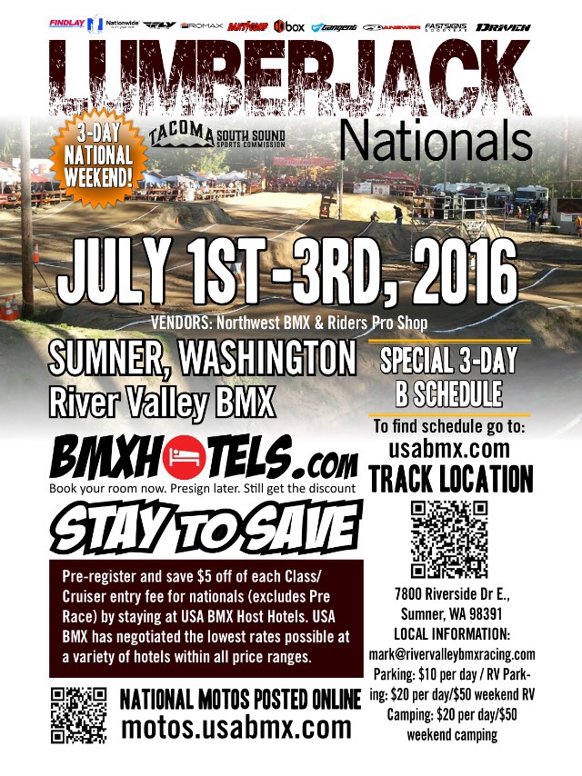 This year, the Lumberjack Nationals return to the Seattle/Tacoma area – to the legendary River Valley BMX in Sumner, WA (once home to the “Lumberjack, Gary Ellis”). With plenty of room for camping for the 3-Day national – with the 4th of July happening on Monday, this is sure to be one of the greatest Nationals to hit the Northwest!