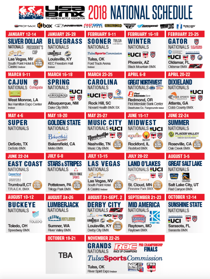 USA BMX is proud to announce the complete 2018 National Schedule. …and by the looks of things, we’re in for another epic year of national caliber racing. Next year’s national season consists of many return venues and quite a few new locations – including a return to Roseville, CA, St.Cloud, MN, Trumbull, CT, Toledo, OH, and Pottstown, PA, with a first-time-ever stop at the dual-hills of Sarasota, FL.