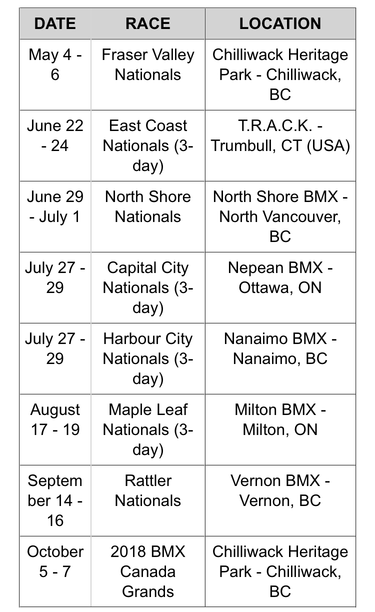 I know that many of you were waiting on the 2018 BMX Canada National Series and the Gold Cup Series schedules. While we are diligently working to get the Gold Cup Series locked in for 2018, we do have the dates confirmed for the BMX Canada National Series. We’ve got some changes coming for 2018 with regards to the BMX Canada National Series as a result of feedback, and we’re happy to try new things in response to that feedback. Therefore, let’s get into what’s new in the series for 2018: