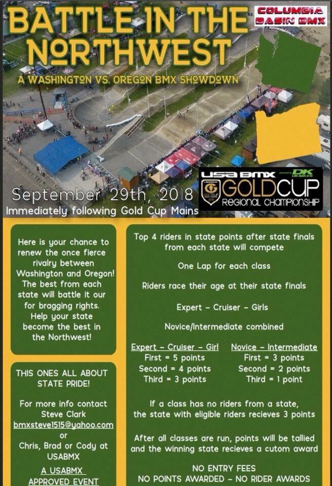 Ok folks, time to step the the Washington/Oregon rivalry. Top 4 state plates from each class from each of our states will battle it out for bragging rights and the chance to win your state an awesome trophy. This is a “One Lap-No Crap” duel to see who is the best from each state. Going down at Columbia Basin BMX on Saturday, Sept 29th immediately following the Gold Cup race. Check out all the info on the flyer and get it in gear, and get a top 4 state plate. More detailed rules can be posted if this isn’t simple enough. Just trying to make racing a little more fun. My e-mail address is on the flyer for questions. 100% USABMX approved and supported, and no entry fee for this showdown.