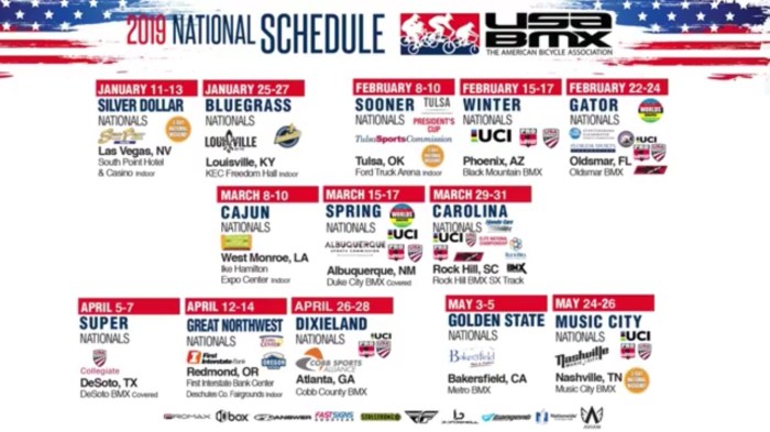 2019 USA BMX National Schedule Announcement By White Lotus Sports on September 12, 2018 • ( 0 ) 2019 USA BMX National Schedule through May. The rest of the years schedule will be announced soon. Share this: Click to email a link to a friend (Opens in new window) Email Click to share on X (Opens in new window) X Click to print (Opens in new window) Print Click to share on Facebook (Opens in new window) Facebook Click to share on Tumblr (Opens in new window) Tumblr Click to share on Pinterest (Opens in new window) Pinterest Click to share on Reddit (Opens in new window) Reddit Like Loading...‹ 2018 USA BMX Washington State FinalsNW Exposure: a BMX Podcast Show – Beeverton S Presquire ›Categories: Racing, VideoTags: aba bmx, Bicycle, Bike, bmx, bmx canada, BMX Oregon, bmx Washington, canada, NBL BMX, Northwest, northwest bmx, nw bmx, oregon, Oregon BMX, race, racing, UCI, UCI BMX, USA, usa bmx, video, washington, washington bmx