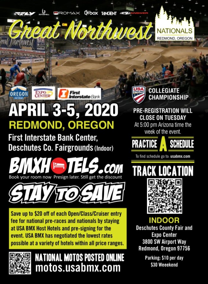 Due to the state bans of crowd gatherings in New Mexico and Oregon, USA BMX will postpone the Spring Nationals (March 20-22) and the Great Northwest Nationals (April 3-5) to a later date. USA BMX will continue to monitor the Covid-19 situation and rely on local authorities in each state with regards to cancellation or postponement of scheduled events as safety for our BMX community remains the priority.