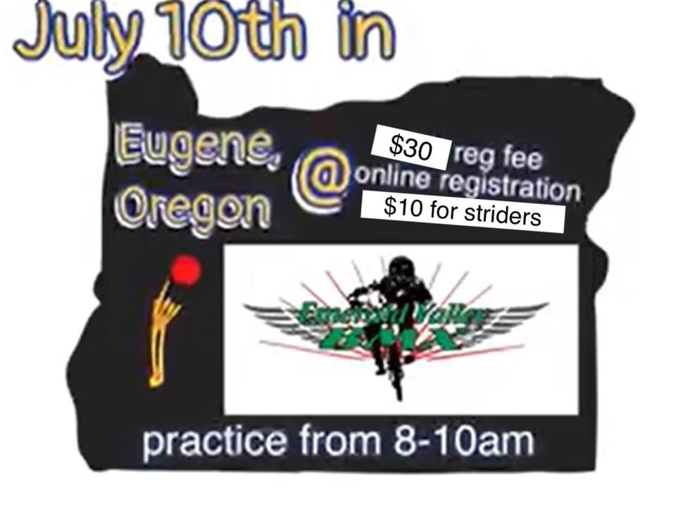 *Online pre-registration for Sunday, July 10th at Emerald Valley BMX. $30 for registration, $10 for striders