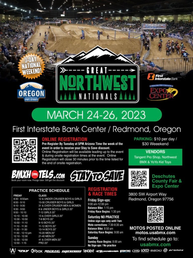 Located indoors at Redmondβs Deschutes County Fairgrounds, the First Interstate Bank Center has played host to the Great Northwest national since 2008 and thereβs a good reason this race keeps returning to Central Oregon. Great track, great racing, great riders and great amenities β from hotels to restaurants.