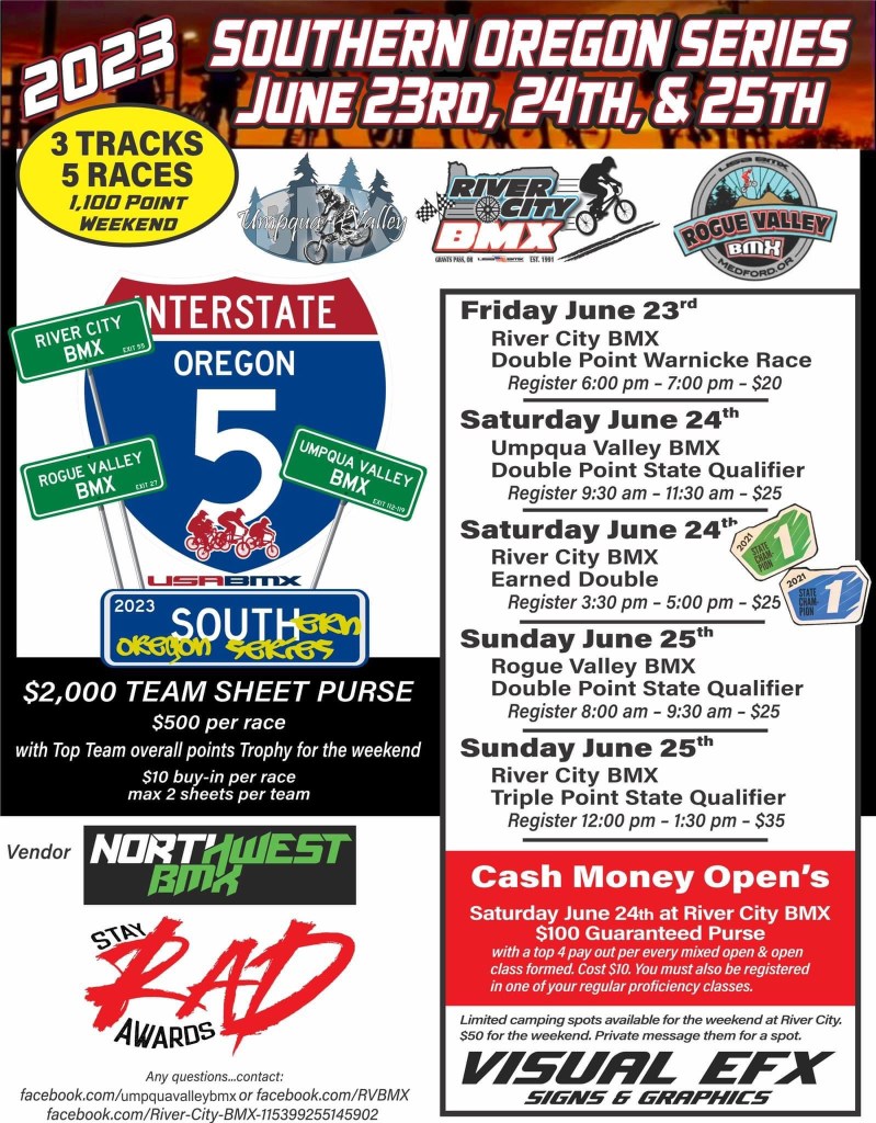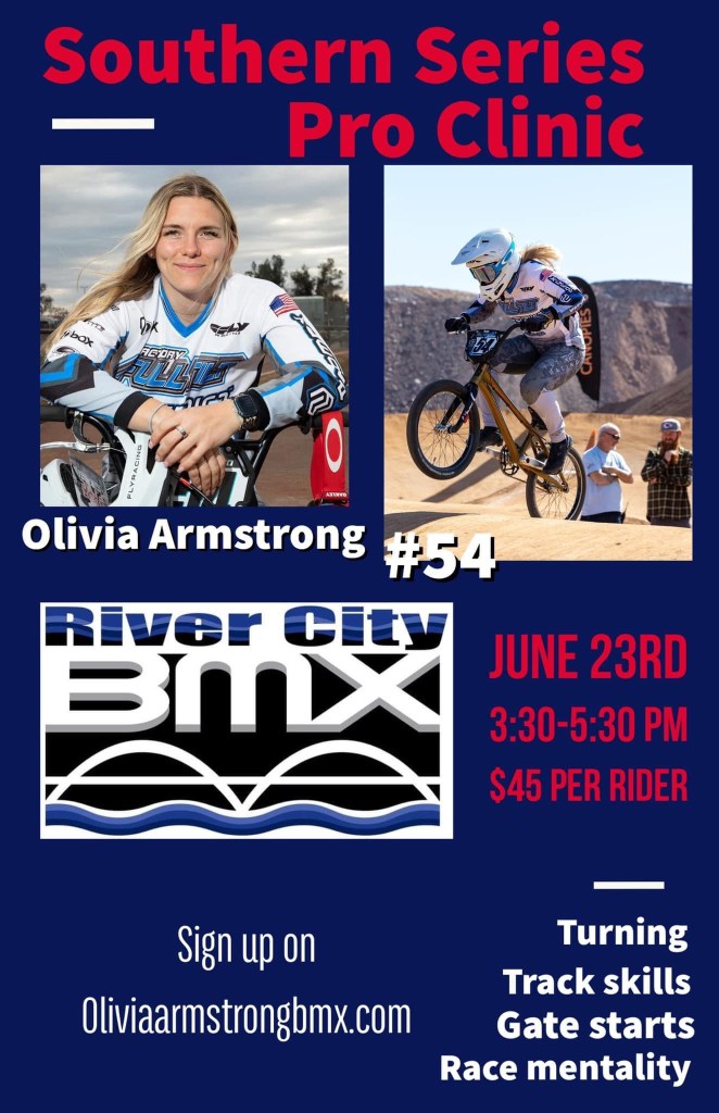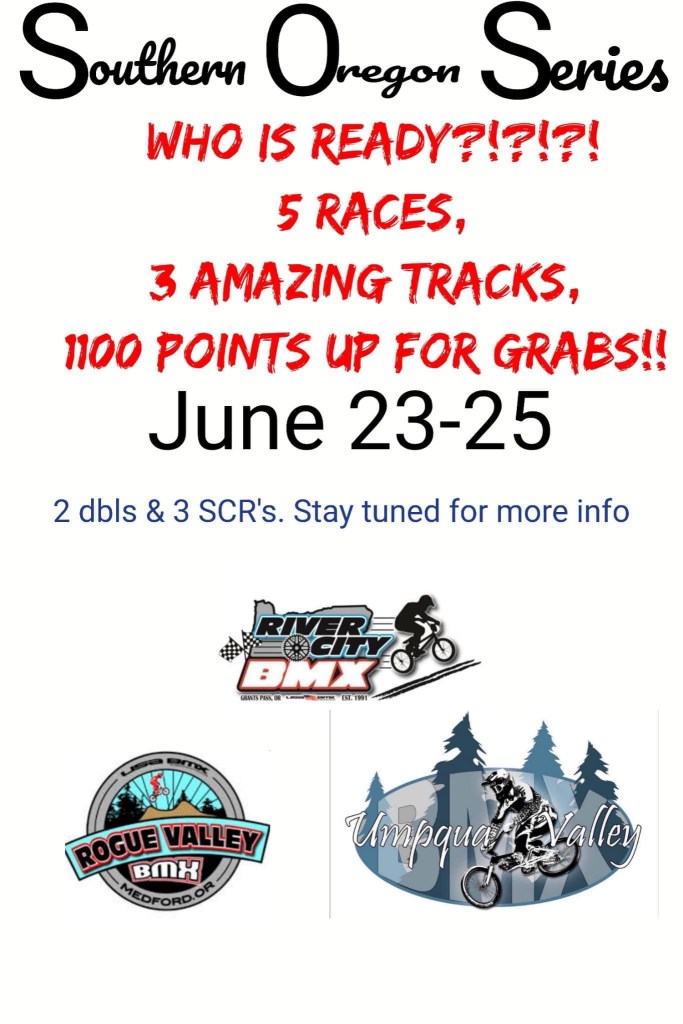 2023 Southern Oregon Series is coming up fast itโ€™s going to be an awesome weekend of racing. River City BMX will kick it off Friday night with our Double point Warnicke Race. All riders that are signed up for the Olivia Armstrong Clinic will get half off the race that night. She will get you dialed in for the weekend. This is an all skills level clinic so lock in your spots, there is a limited number of them. Link below.