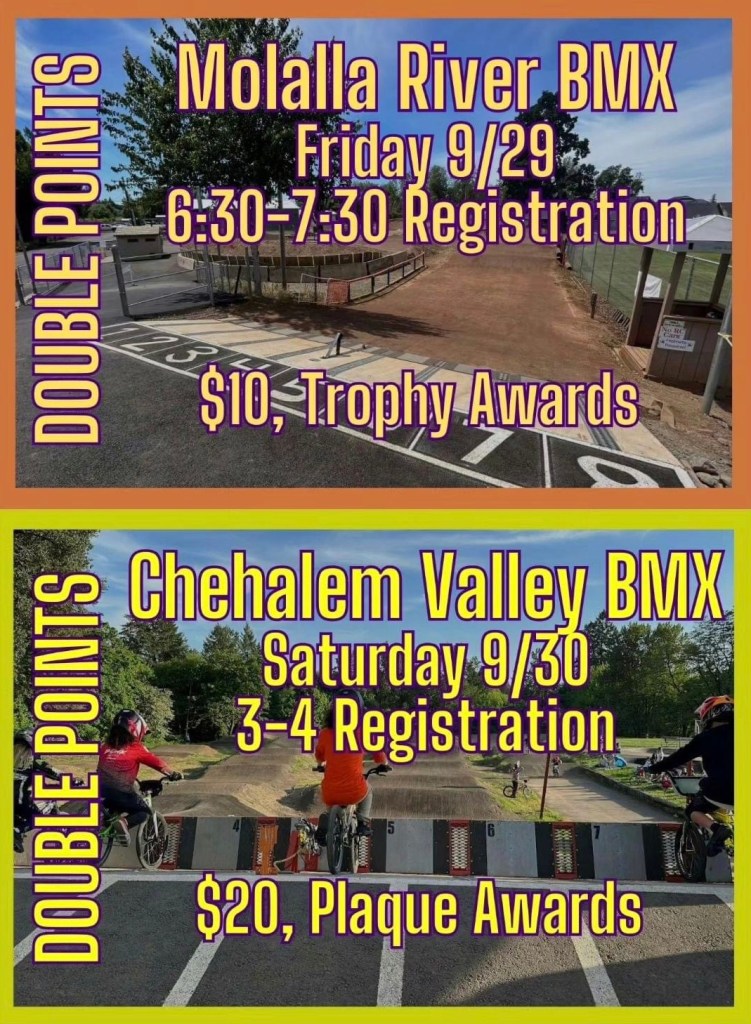 Double, Double, Double! 600 Point weekend coming up! Head over to Molalla River BMX Friday the 29th for their double point race. Then back to Chehalem Saturday for another double. Then swing over to BEND BMX for their Sunday double!