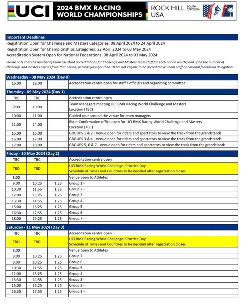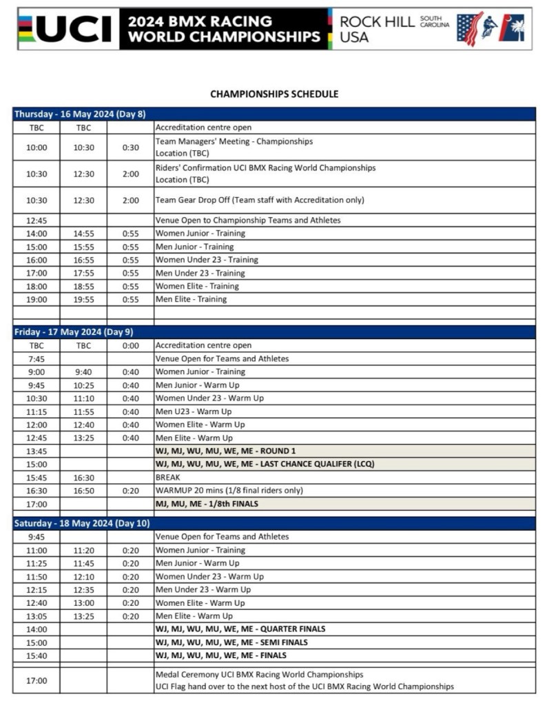 Official BMX World Championship WebsiteUCI Event ScheduleUCI Event PageEvent Ticket LinkTeam USA Packet Pickup & Meeting LocationUCI Final Entry List UPDATES FROM ROCK HILL